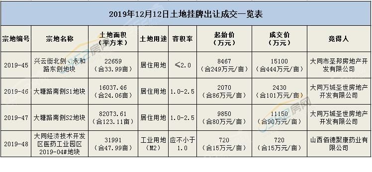 1、12月12日,大同市规划与自然资源局公开出让四宗地块,其中3宗居住用地,1宗工业用地,其中兴云街北侧、永和路东侧地块最高以444万/亩的价格成交,详细情况一起来了解一下吧!