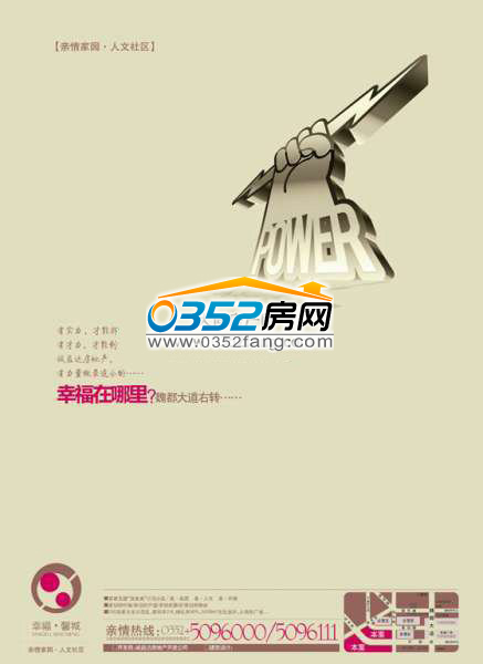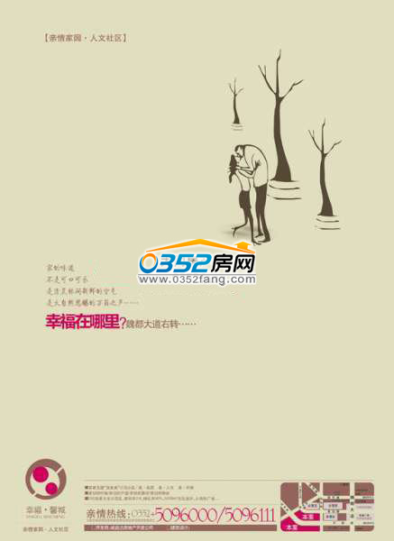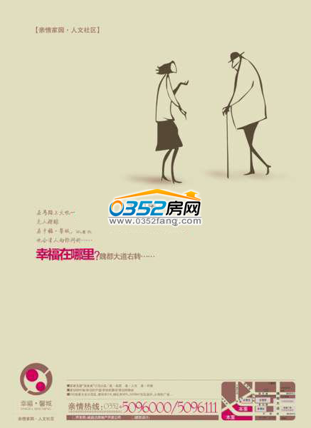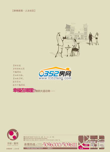 幸福馨城,占地210亩的纯居住小区,位于城南煤气公司对面,为全市首家主题“真善美”示范小区,全案围绕“亲情家园 人文社区”的主线设计,具体表现为:亲切价格、亲切户型、亲切景观和亲切物业,项目通过对人、建筑、环境三者关系的准确把握,将具有东方人文精神的生活模式,植入社区文化体系,以情带情,以诚换诚,营造快乐和谐的老街坊邻里气氛。
