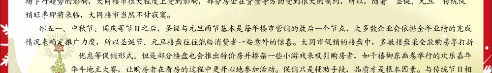 年底开发商的促销活动精彩纷呈,虽然顶着回款的压力,但是依旧想尽各种办法吸引购房者买房。而且继五一、国庆等假期后,圣诞、元旦双节到来,开发商促销力度有增无减,争取能在年底之前将待售的房屋尽量多的推销出去。在这个时候,对于准备置业的购房者来说是个置业的好时机,新房的优势不言而喻,可以以实惠的价格买到满意的户型,准备置业的购房者不妨把握一下吧!
