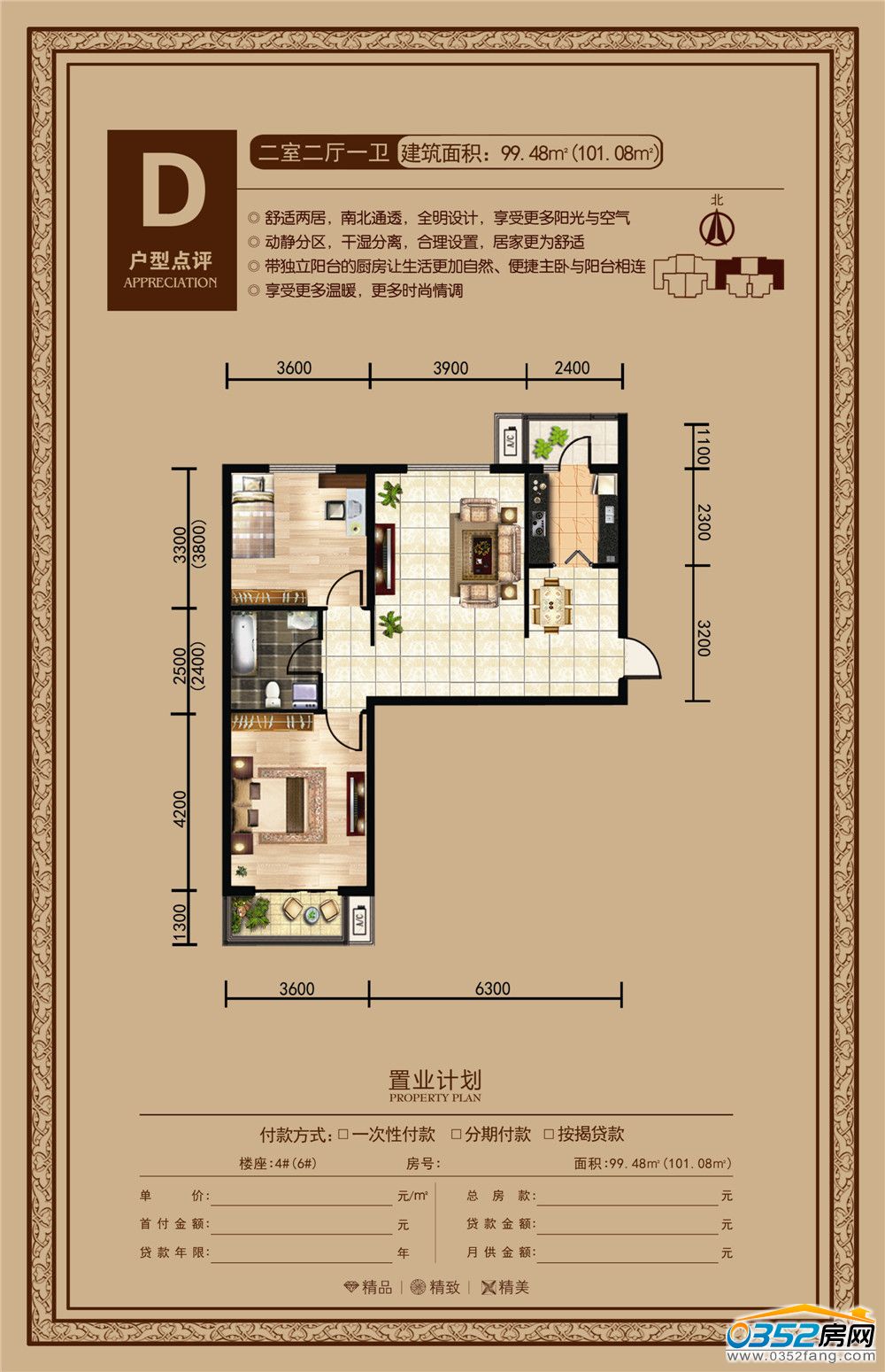 付款方式:一次性付款,96折优惠;银行按揭首付30%,贷款98折优惠;支持公积金(大同市内公积金均可),首付30%,公积金贷款无优惠。不支持分期。