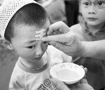 端午饮雄黄酒的习俗,在长江流域地区极为盛行。古在没有碘酒之类消毒剂的古代,用雄黄泡酒,可以祛毒解痒。未到喝酒年龄的小孩子,大人则给他们的额头、耳鼻、手足心等处涂抹上雄黄酒,意在消毒防病,虫豸不叮……