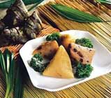 南方粽子的代表,个头比北方粽子小很多,外型别致,正面方型,后面隆起一只尖角,形状象锥子。馅料一般由鸡丁、鸭丁、冬菇、绿豆等调配出来,荤素搭配。