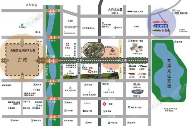 兴云华庭项目位于大同市御东新区兴云街与文兴路交汇处西北角,雄踞御东新区要地,坐拥御河波澜,又瞰文瀛壮阔;一路向东可达大同高等学府大同大学与大同政治文化新中心——太阳宫与五大场馆,得天独厚的自然环境,润养一方水土,优质卓越的文化资源,培养万千人才。兴云华庭项目杰出的人文环境,让其在御东众多楼盘当中,更显不凡。