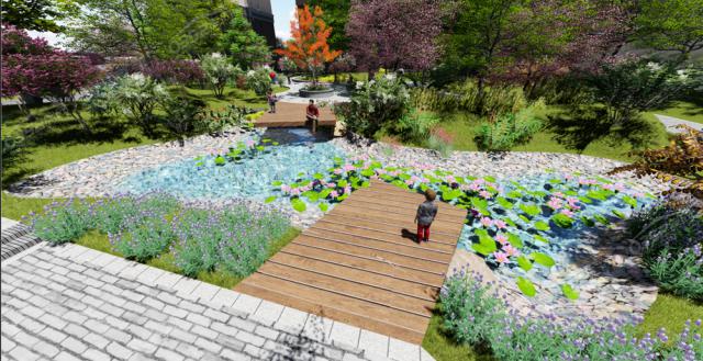 小区里的各种建筑造景,全部是精心设计,小径通幽,步履闲淡,携花香,过月门,令人心中油然而生一种静谧之感,一份幽隐之韵。小区里最大的水景——蝠池,形状如展开翅膀的蝙蝠,池边将种植榆树,其果实榆钱落入池中时,被寓意为福财满池,吉祥福裕。