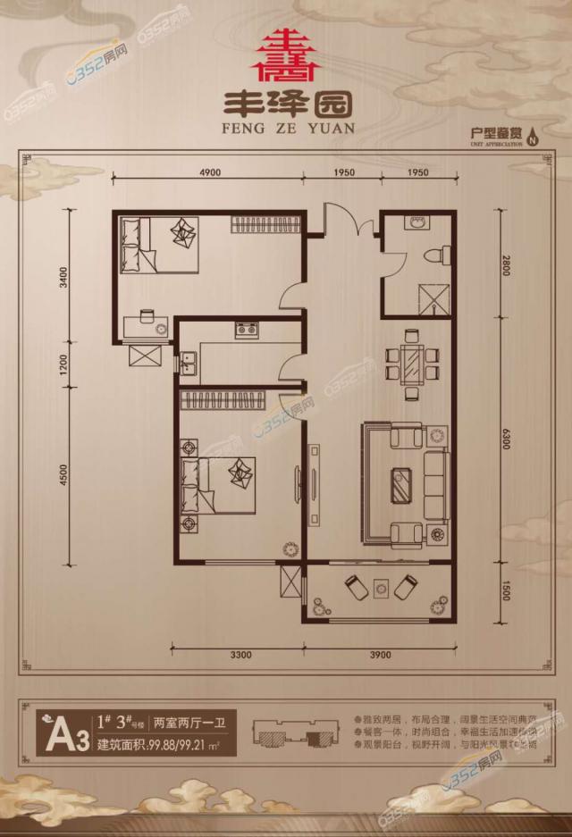 户型解读:该户型为雅致两居,布局合理,动线灵活,打造阔景生活空间典范;餐客一体,时尚组合,生活方便;步入式观景阳台,视野开阔,与阳光风景零距离。