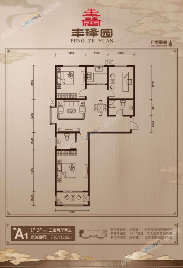 A1户型:建面约117.18/113.85㎡ 三室两厅两卫