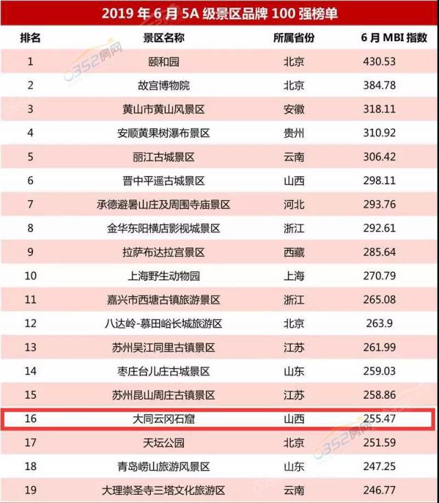 好消息!云冈石窟荣登19年6月5A景区100强榜单