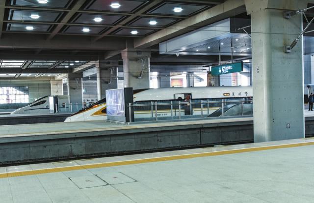 进站大厅的正前方就是站台,停靠在站台的“和谐号”列车清晰可见。技术人员正抓紧对两部自动扶梯进行检测,确保运行稳定。高架候车大厅正中央的“12306”环岛服务台已经完成施工,现场好几名工作人员正忙着安装座椅,保洁人员正准备前往清洗站台上的尘土以及施工过程当中残留的混凝土。