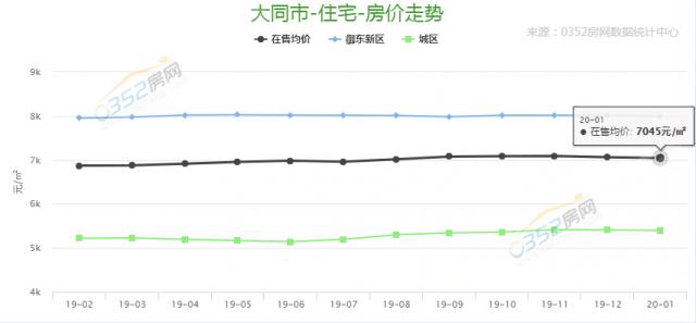 环比2019年12月份,大同2020年1月在售商品房均价每平米下降18元,环比下降0.3%;同比来看,2020年1月大同在售商品房均价7045元,2019年1月大同在售商品房均价为6883元,房价上涨幅度较大,每平米上涨162元,同比上涨2.3%。