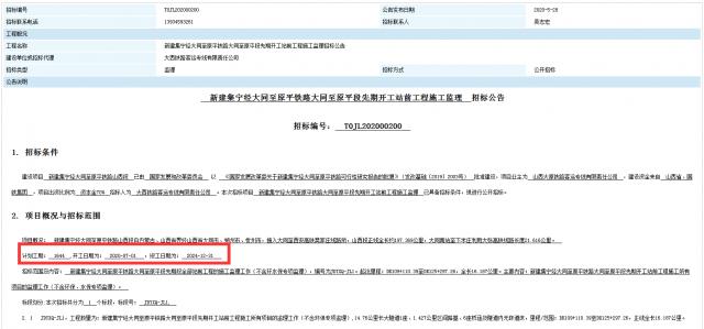 目前, 建设项目 新建集宁经大同至原平铁路山西段 已由 国家发展和改革委员会 以 《国家发展改革委关于新建集宁经大同至原平铁路可行性研究报告的批复》(发改基础[2019]2003号) 批准建设。项目预计开工日期为2020年7月1日,计划竣工日期为2024年12月31日,计划工期1644天。