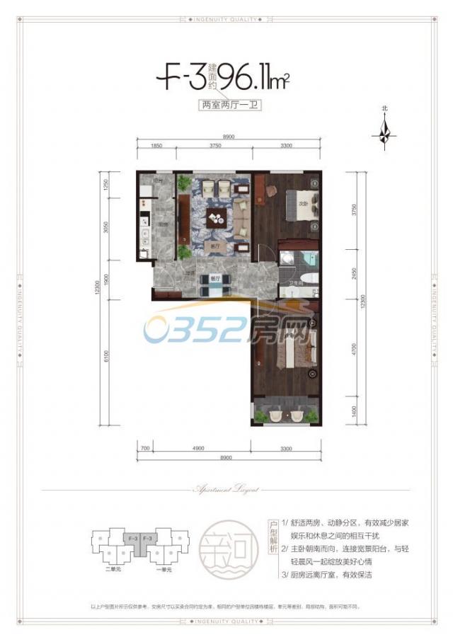 F3户型:建面约96.11㎡ 两室两厅一卫