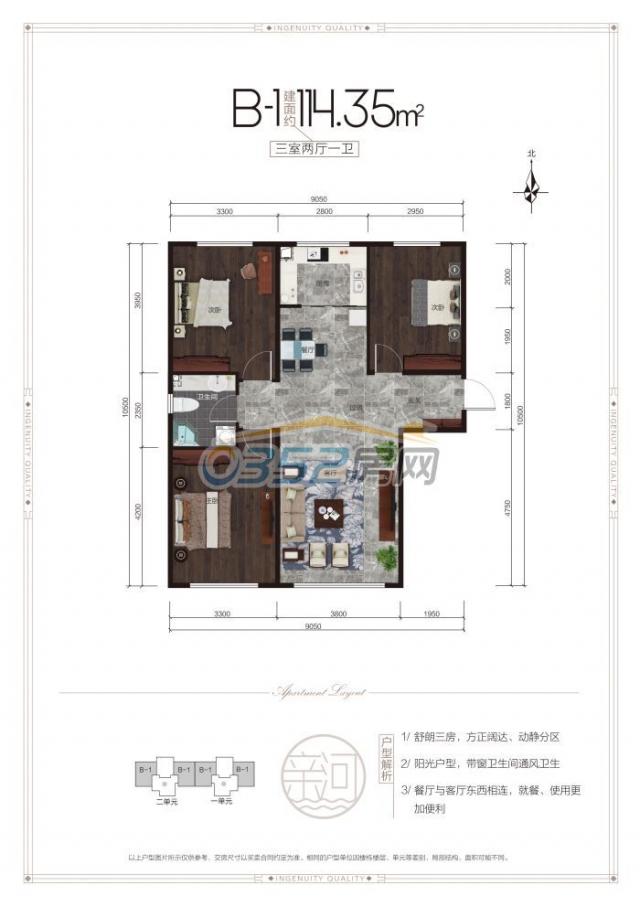 B1户型:建面约114.35㎡ 三室两厅一卫