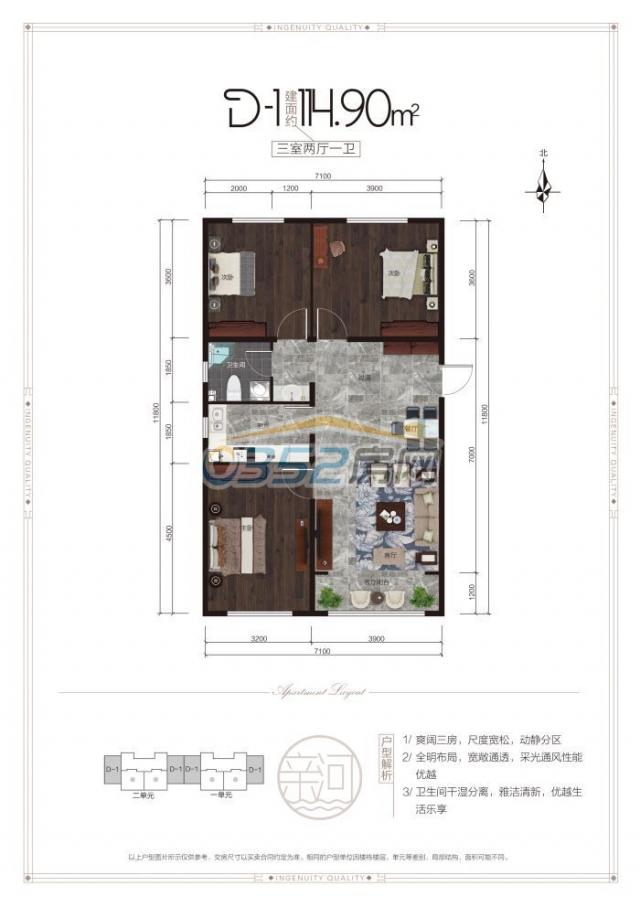 D1户型:建面约114.9㎡ 三室两厅一卫