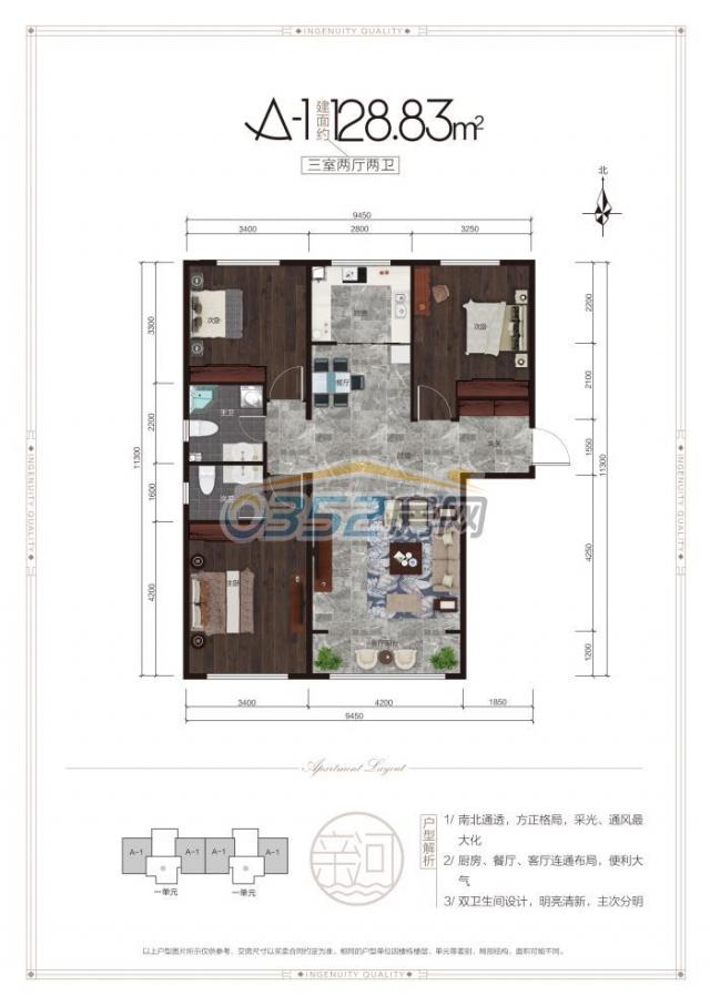 A1户型:建面约128.83㎡ 三室两厅两卫