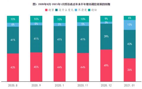 根据报告,整体来看,近期热点城市持续补丁调控,受访者对政策预期呈稳定偏紧状态。相比2020年12月,2021年1月预期政策将要趋紧的受访者的占比下降至36%,预期不变的占比上升至43%,预期宽松的占比下滑至6%,整体政策调控预期维持稳定偏紧状态。
