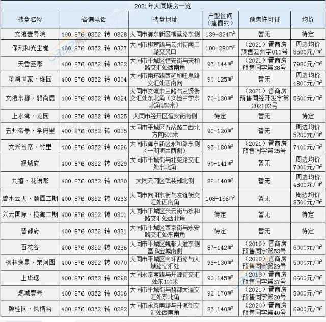 为了让购房者能够更直观的了解到大同楼市现况,以下即为小编整理好的2021年大同楼市已出案名的期房与现房项目的汇总,各位购房者可以进行一定的选择与对比。