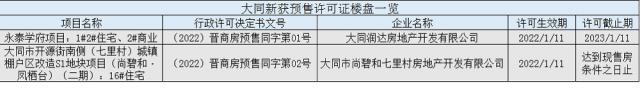 以下为截止至2022年1月11日,大同新获预售许可证的楼盘:
