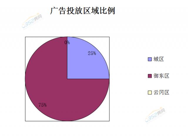 本周大同房地产广告从投放区域来看,御东占3条,占比75%,城区占1条,占比25%,其他区域无广告。