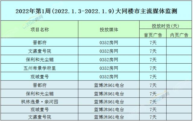 2022年第1周(1.3-1.9)大同楼市主流媒体监测