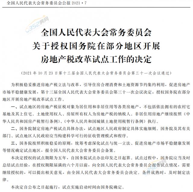 2021年10月22日,全国人大常委会议决定将在国内部分地区开展房地产税试点工作,时长5年。