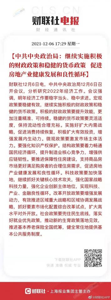 2021年12月6日,中央政治局召开会议,提出“支持商品房市场更好满足购房者的合理住房需求,促进房地产业健康发展和良性循环。”这一观点。