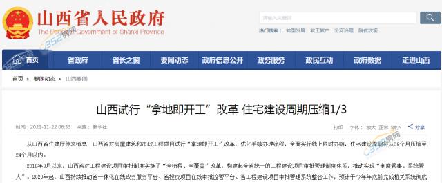 2020年11月16日,相关会议正式公布山西将试行“拿地及开工”改革,到2022年上半年,将全流程审批压缩为4个环节、25个工作日以内,到2023年进一步压减至10个工作日以内。