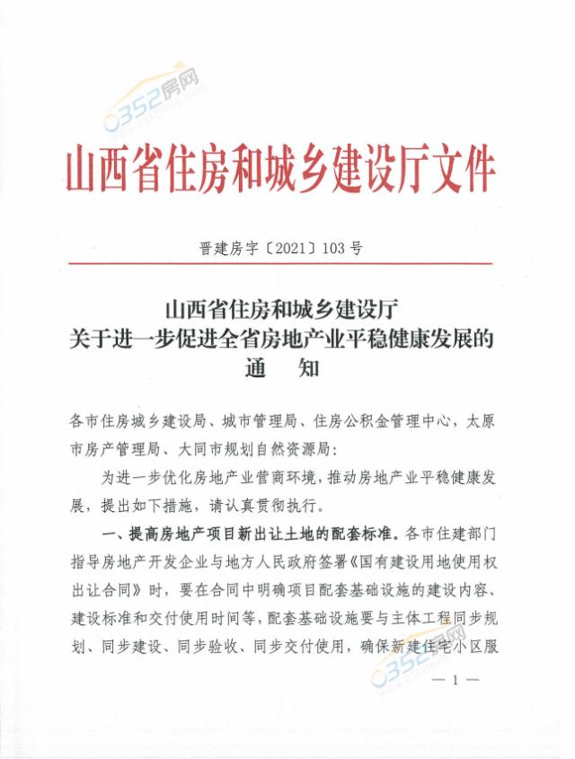 2021年7月13日,山西省住房和城乡建设厅发布关于进一步促进全省房地产业平稳健康发展的通知,明确10项举措推动房地产业平稳健康发展。