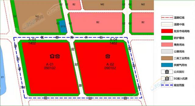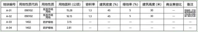 将A-01、A-02地块规划为批发市场用地;将A-03、A-04地块规划为防护绿地。