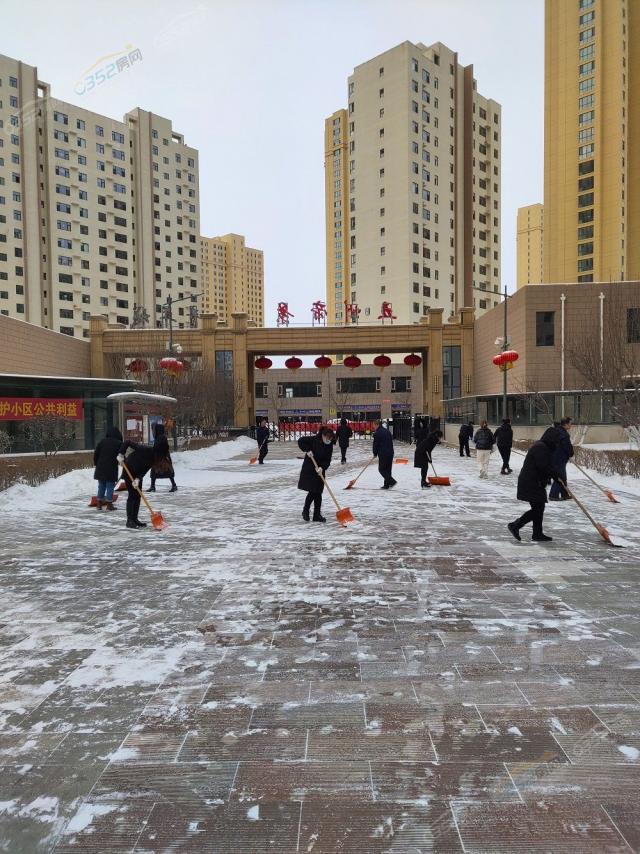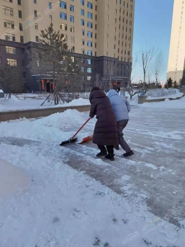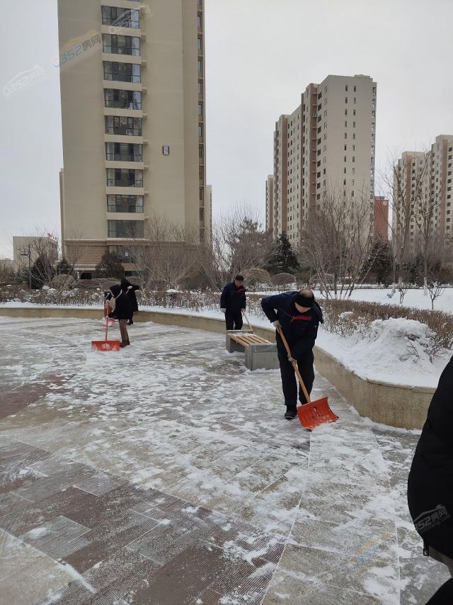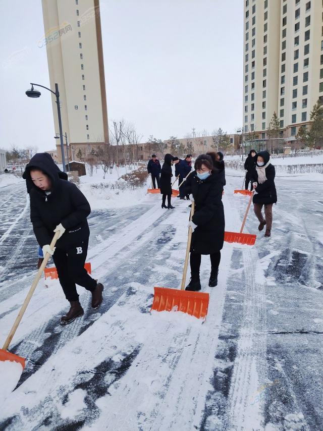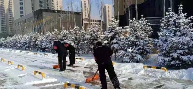 工作人员冒着严寒,挥舞着扫帚、铁锹、推雪板对地库出入口、主干道及园区内外部道路进行清扫,为广大业主家人开辟出一条条畅通安全的道路。