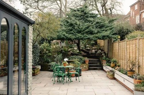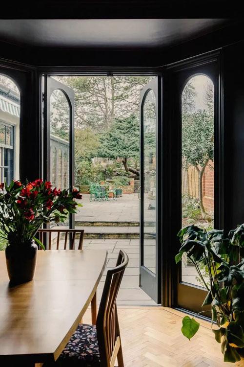 深绿+粉色+黑色,很难想到一起的颜色组合,但这里搭配出来很英式很和谐。配合牛排煎汉堡煎牛肉干,烤土豆煎炸薯条煎土豆泥这些英式菜来说,这样的厨房足够了。主人把厨房和后花园打通,还搭建了个玻璃阳光房,打造了一个烧烤的好地方,这点很吸引人。