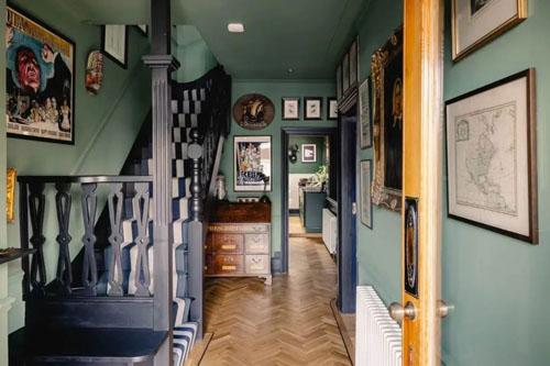 蓝色与绿色都象征着许多积极情绪,给人以舒适、可靠的感觉,用在楼梯间作为背景,也能焕活宁静空间。加上背景中挂着各种画作,踩着楼梯一路向上,仿佛就能带回往昔的岁月。