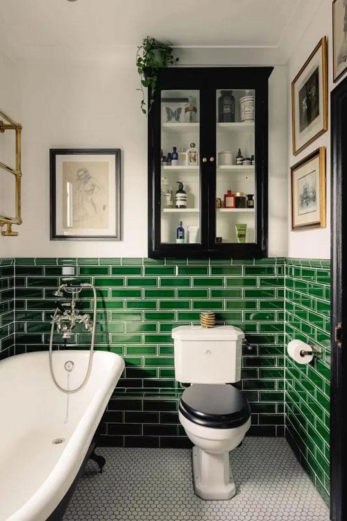 绿色面包砖的色彩彩的非常不一样,像是祖母绿宝石一样,透露出一种低调高贵的复古风情。贝壳纹的马赛克瓷砖,带来一阵惬意清透的凉风。挂画、绿植的点缀,以及金属、玻璃的凌冽,送上一袭沁人心脾的舒适温度。