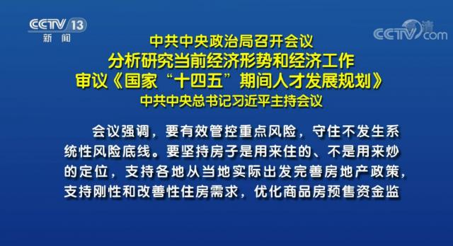 Q95;Q95;会议强调,要有效管控重点风险,守住不发生系统性风险底线,要坚持房子是用来住的、不是用来炒的定位,支持各地从当地实际出发完善房地产政策,支持刚性和改善性住房需求,优化商品房预售资金监管,促进房地产市场平稳健康发展。