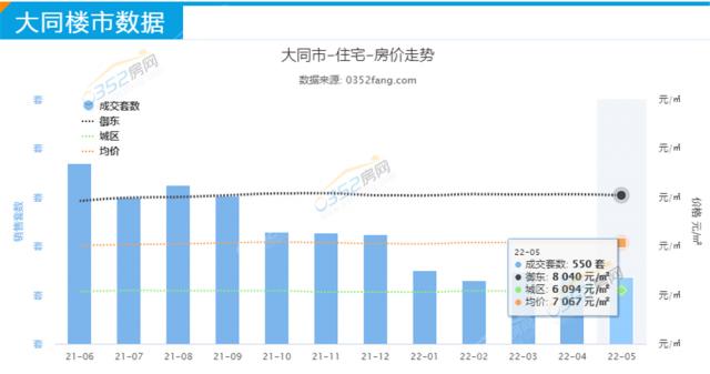 据小编不完全统计,2022年5月大同楼市总成交套数550套左右,总成交面积约6.9万平方米,总成交额约5个亿;2022年4月大同楼市总成交套数570套左右,总成交面积约7.2万平方米,总成交额约5.3个亿,环比4月,2022年5月大同楼市整体销量走势呈小幅下降。
