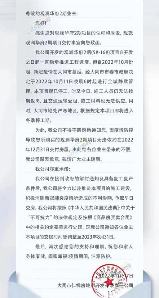 摘要:观澜华府二期发布延迟交房公告,因疫情防控原因,以及大同冬季停工季的影响,5#-16#楼无法依约在2022年12月31日交付,暂时将交房时间调整为2023年8月31日,敬请广大业主谅解。