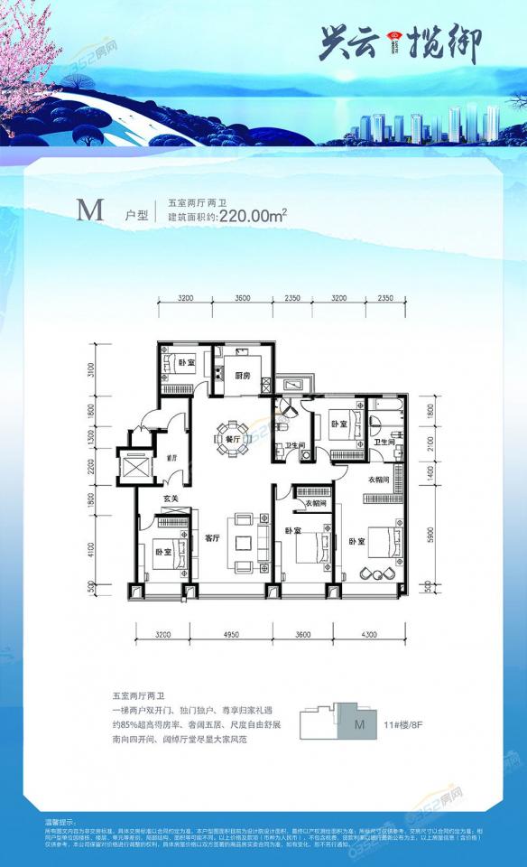 兴云揽御,建面约168-222㎡洋房,户型方正,朗阔四居/五居,敞阔双厅,奢享更多阳光;在功能空间的规划上,将客、餐厅与厨房连在一起排布,提高户型实用性,最大限度的减少空间浪费;主卧套房设计,步入式衣帽间+私卫设计,保障主人生活起居私密性,更显尊崇。