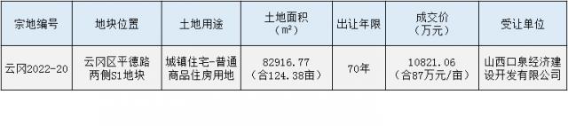 以上就是本次地块成交的全部内容啦,云冈2022-20地块容积率为1.0-2.8,未来还是以建设高层住宅为主,云冈区又多购房新选择!