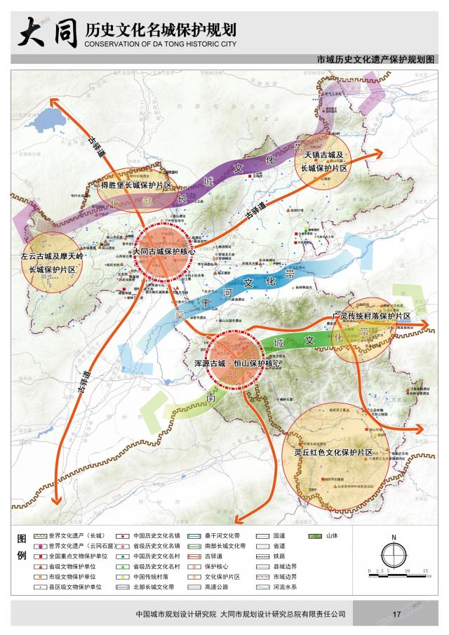 以南部、北部山体和中部桑干河构成的自然基底,形成大同市域“两核五片、三带多线”的历史文化保护总体格局。“两核”指历史文化遗产分布最为密集、历史文化价值最为突出的大同古城和浑源古城-恒山两大历史文化保护核心;“五片”指历史文化资源富集片区:左云古城及长城保护片区、得胜堡长城保护片区、天镇古城及长城保护片区、广灵传统村落保护片区、灵丘红色文化保护片区;“三带”指南、北长城文化带和中部的桑干河文化带;“多线”指多条古驿道线路。