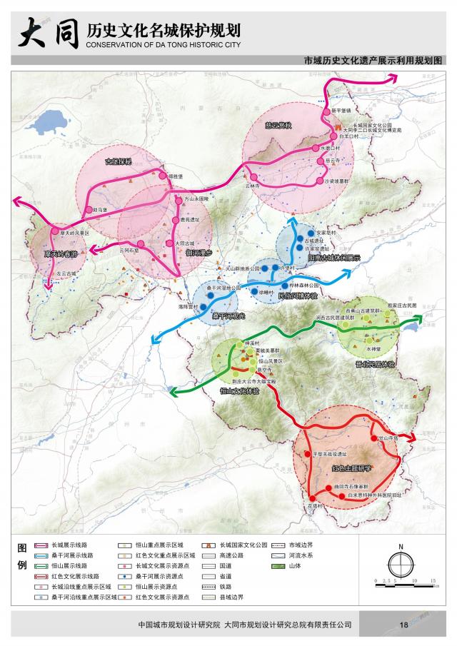 构建长城探险观光展示体系、桑干河自然风光和民俗展示体系、恒山自然和历史人文综合展示体系、平型关红色革命文化展示体系四个展示体系形成的十条主题展示游线,通过串联沿线各类历史文化资源、历史村镇、自然文化要素等,全方位展示大同的历史文化特色。