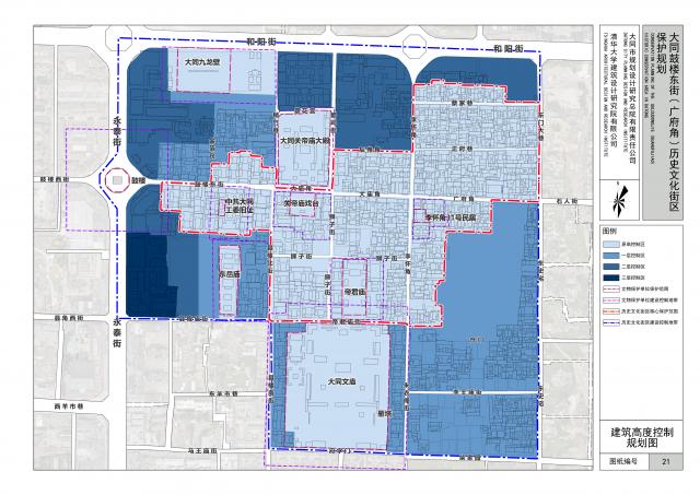 本次街区保护规划高度控制要求与《大同历史文化名城保护规划》要求保持一致,街区核心保护范围内以及文物保护单位院落为原高控制区,建设控制地带划分为一、二、三层控制区。其中: