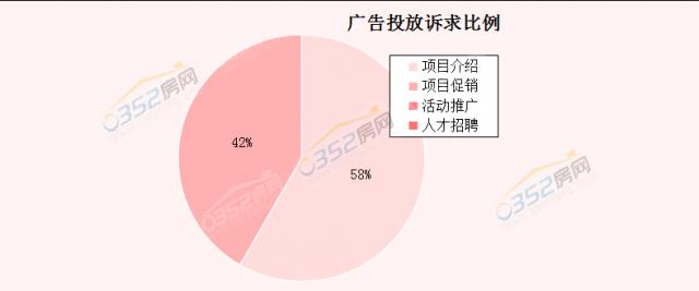 广告中,诉求点是关键内容,在此次统计中,整体上看,广告诉求稍有落差,主要是项目介绍,其次为项目促销。