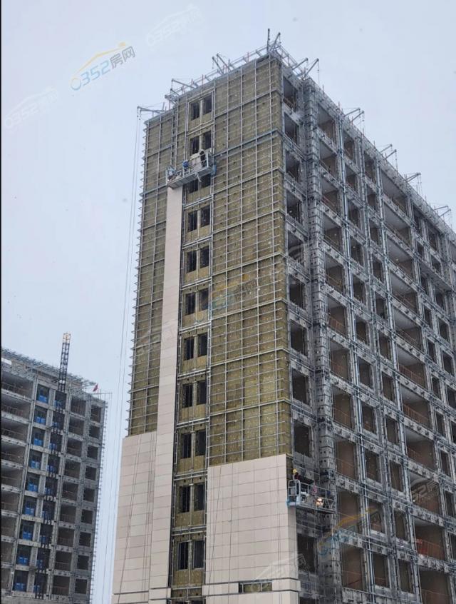 华远天瀛,主楼外装饰幕墙龙骨施工完毕,项目西侧外墙干挂石材正在进行中。