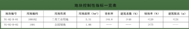 规划确定D-01地块用地性质为二类工业用地(100102),用地面积5.31公顷:D-02地块用地性质为公园绿地(1401),用地面积1.06公顷。依据规划用地性质赋予地块相应控制性指标。