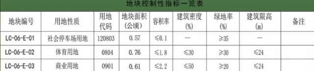 规划确定LC-06-E-01地块用地性质为社会停车场用地(120803),用地面积0.57公顷;LC-06-E-02地块用地性质为体育用地(0804),用地面积0.76公顷:LC-06-E-03地块用地性质为商业用地(0901),用地面积0.61公顷。依据规划用地性质赋予地块相应控制性指标。