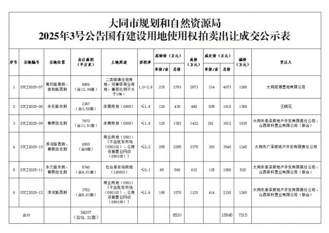 摘要:大同市规划和自然自然局2025年3号公告国有建设用地使用权拍卖出让成交公示,共有六宗地块成功拍卖,包含1宗城镇住宅用地,2宗体育用地,2宗商业用地,1宗社会停车场用地,具体成交详情如下。