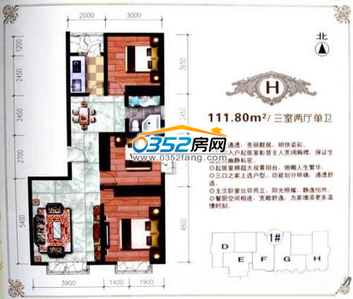 H户型明快姿彩,轩敞入户,起居室彰显主人宽阔胸襟,保证了生活区间幽静私密。主次卧