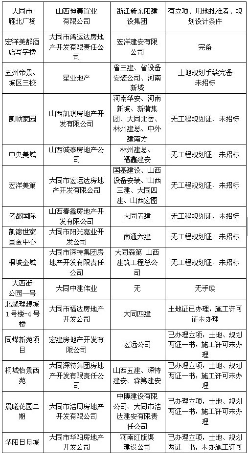 目前已办理立项、用地、规划两证一书,未办理施工许可证项目有:瑞兴花园、同煤机电园区、东小城商业一期、同煤新苑项目、桐城怡景、华阳日月城、晨曦花园二期、大同亿丰世贸中心一期建设项目、紫润芳庭、宜景尚都小区、华天苑府城、218金茂国际、弘雅大厦、开源街北二路北侧商业综合楼、魏都新城商务综合楼;