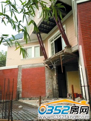 记者找到2073号别墅,发现其被挡板围住,别墅门口大柱子已被拆掉,两根钢筋支撑着别墅突出的部分,门前满是钢筋和建筑材料,非常杂乱。“这个是独栋别墅,面积加起来约有800平方米,还在扩建,这么贪心啊。”维权业主表示。