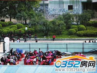 12月21日晚,旧村改造的指挥中心板房里,村里摆起了餐桌,已经签约的村民正集体聚餐;已签约的村民接到通知,12月22日晚在禅城一家酒店仍有饭吃。一墙之隔,15家被强拆的钉子户待在唯一尚未被强拆的钉子户罗建华的家门口。