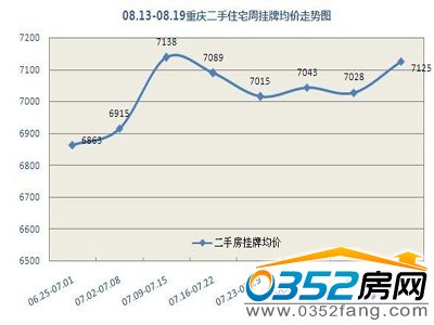 根据重庆二手住宅周挂牌均价走势图显示,近两个月的楼市迹象表明,重庆二手房房价正处于一个受市场和政策双向控制的徘徊期,周期价格均无大的波动。重庆主城二手住宅挂牌均价为7125元/平米,与前一周7028元/平米均价相比,环比上涨97元/平米,涨幅为1.38%。继8月第二周重庆二手房挂牌均价下跌后,8月第三周迎来上涨。据搜房网二手房监控中心分析师分析,在房地产市场成交量持续反弹后,价格开始上涨,涨幅的进一步扩大,楼市复苏迹象明显,若调控没有出现大的变化,未来几个月有望维持这一趋势,但会相对理性,“金九银十”现象或不再突出。